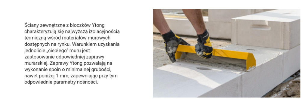 Ściany zewnętrzne z bloczków Ytong charakteryzują się najwyższą izolacyjnością termiczną wśród materiałów murowych dostępnych na rynku. Warunkiem uzyskania jednolicie „ciepłego” muru jest zastosowanie odpowiedniej zaprawy murarskiej. Zaprawy Ytong pozwalają na wykonanie spoin o minimalnej grubości, nawet poniżej 1 mm, zapewniając przy tym odpowiednie parametry nośności.